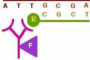 Révélation par reconnaissance de la molécule R par un anticorps anti R muni d'un fluorophore F. L'observation au microscope à fluorescence permet de visualiser la présence de la séquence cible. |