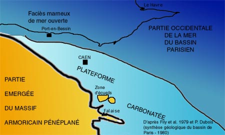 Le calcaire de Caen se dépose, il y a -165MA, dans une mer peu profonde, à proximité d'un rivage (bois flottés, cadavres d'animaux terrestres...)