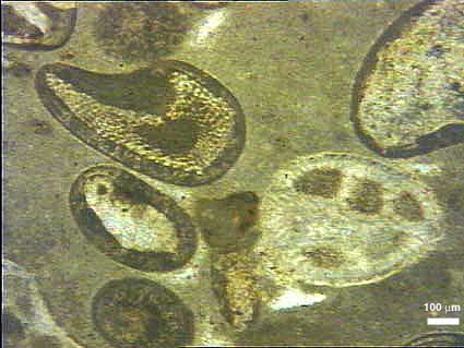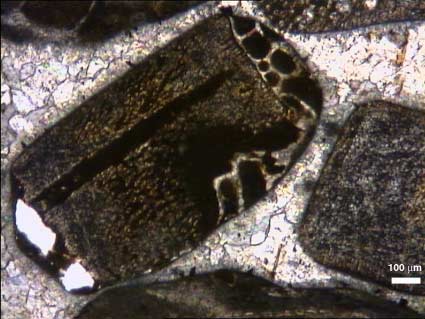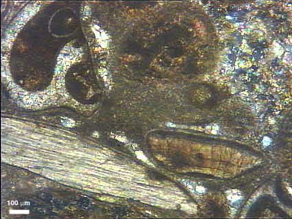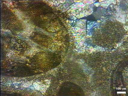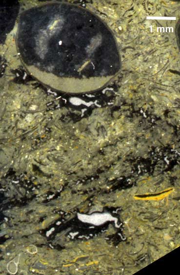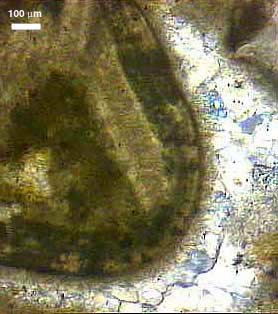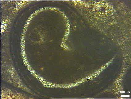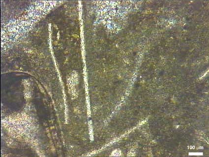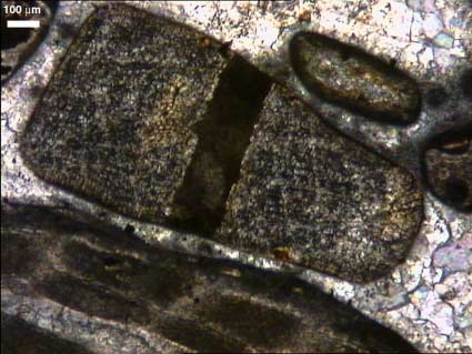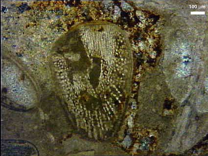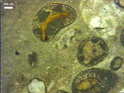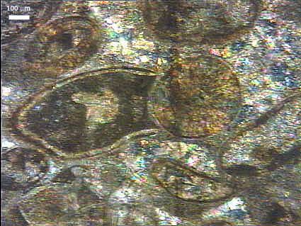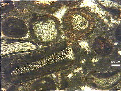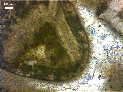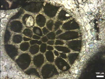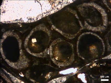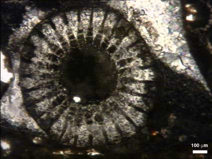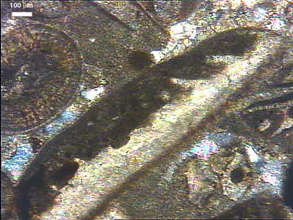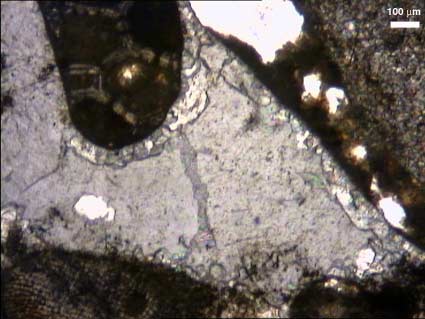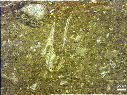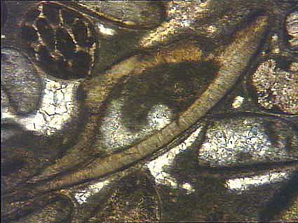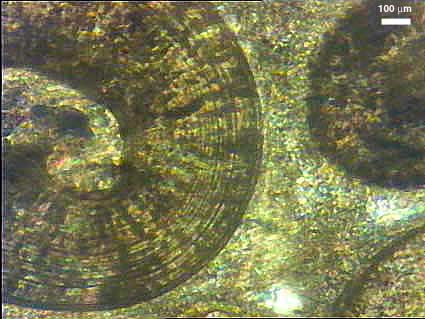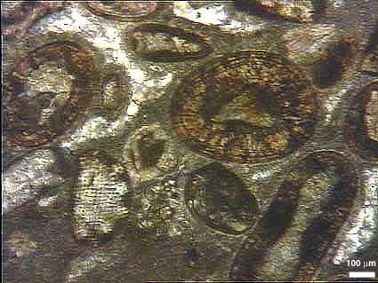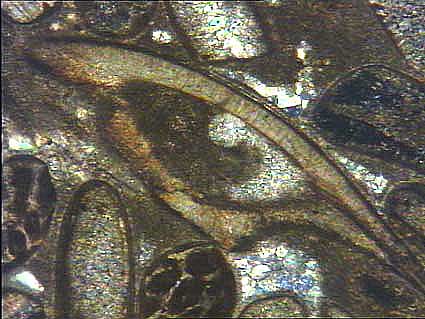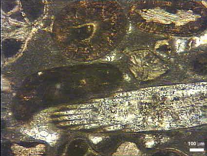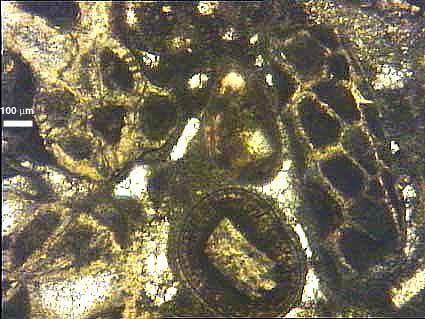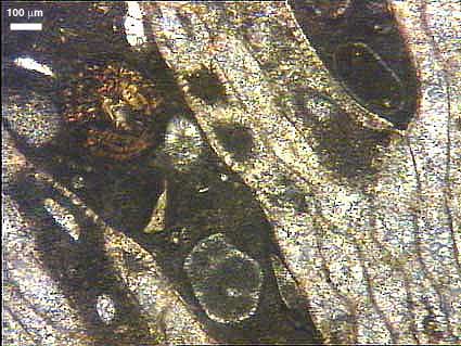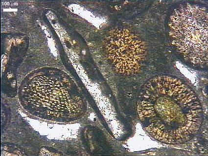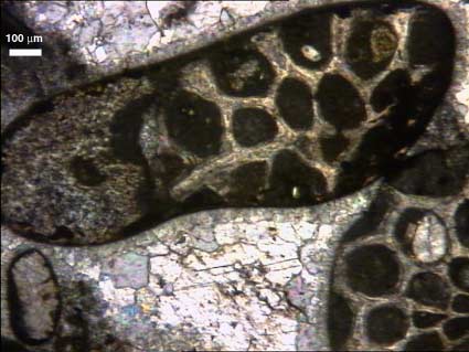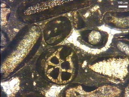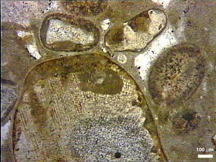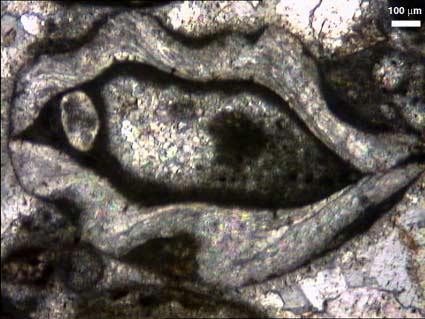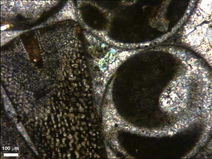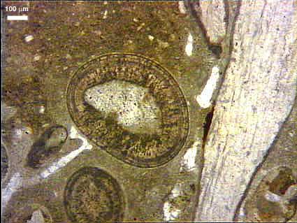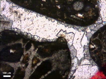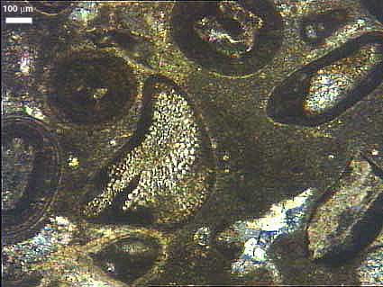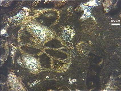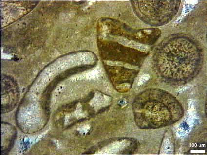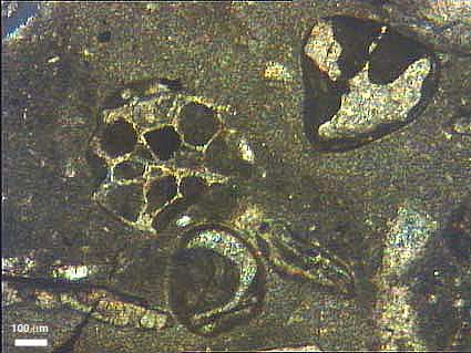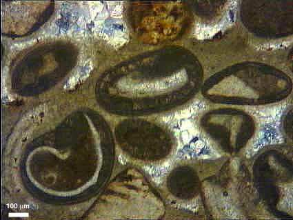 Gastéropode, ciment micritique et fenestræ sparitiques