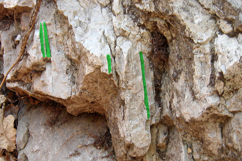 Du bas vers le haut, on distingue plusieurs traces de repos à la surface du banc.