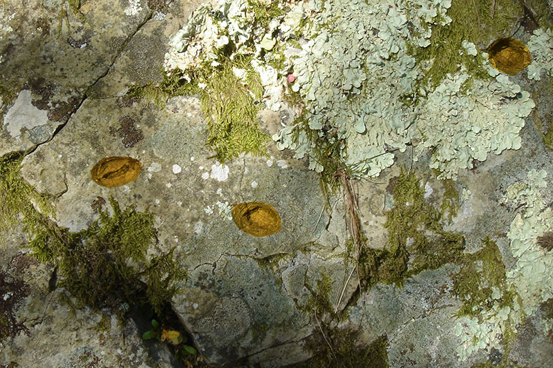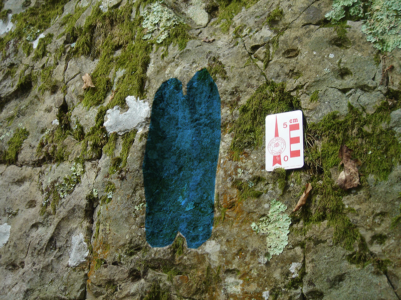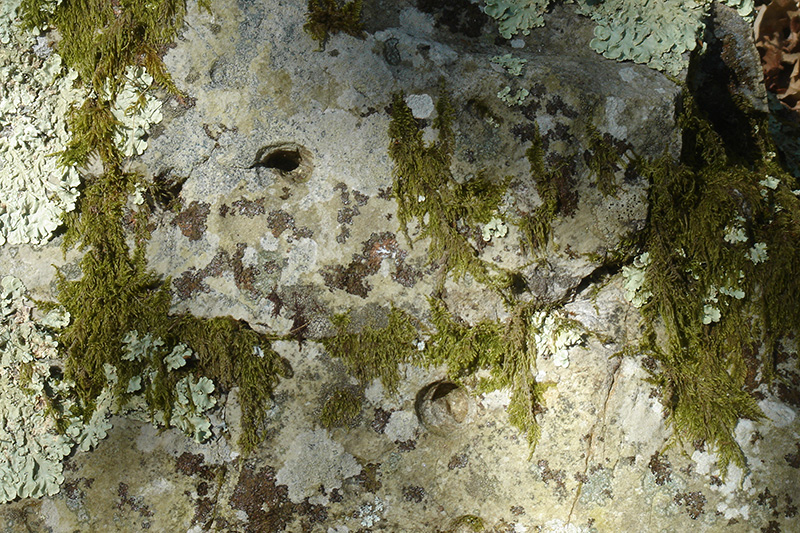 A la surface du banc, plusieurs traces en creux, larges et bilobées, correspondent à des traces de trilobites appelés localement « pas-de-bœufs ». De plus, toute la surface est constellée de perforations qui sont les ouvertures de terriers d’animaux vivant enfouis dans le sable.