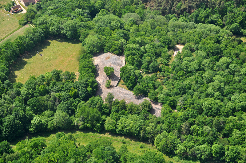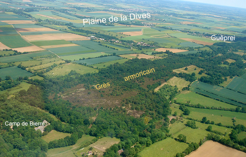 Vue aérienne de la barre de Grès armoricain orientée N110, du Camp de Bierre au Vaudobin, situé au Sud de Guépréi.
