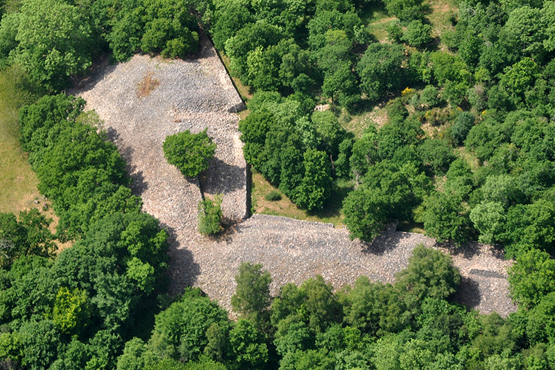 La fortification de l’extrémité Sud, dégagée de la végétation arborescente, présente une imposante accumulation de blocs de quartzite issus de la barre de Grès armoricain. |