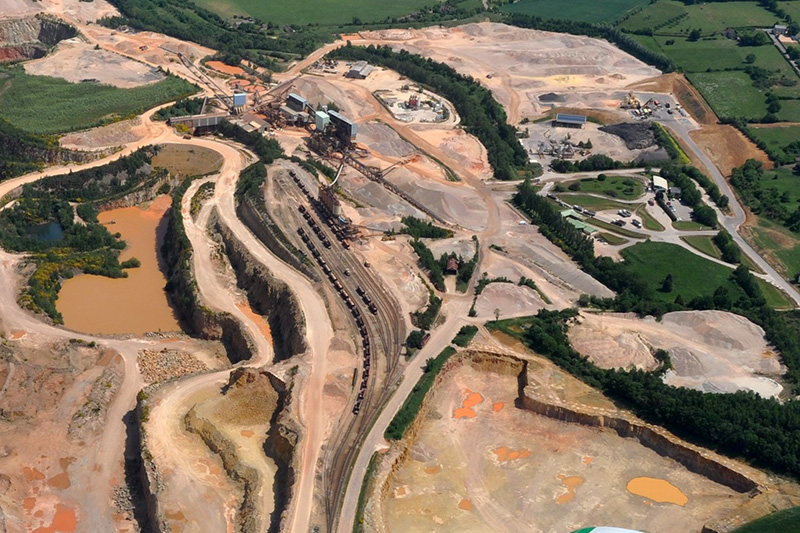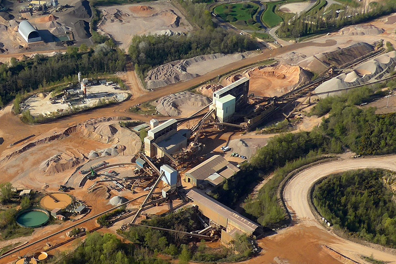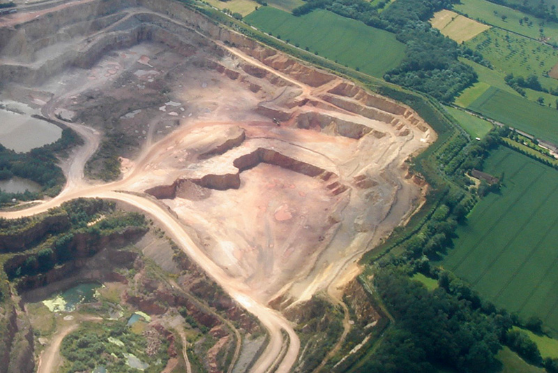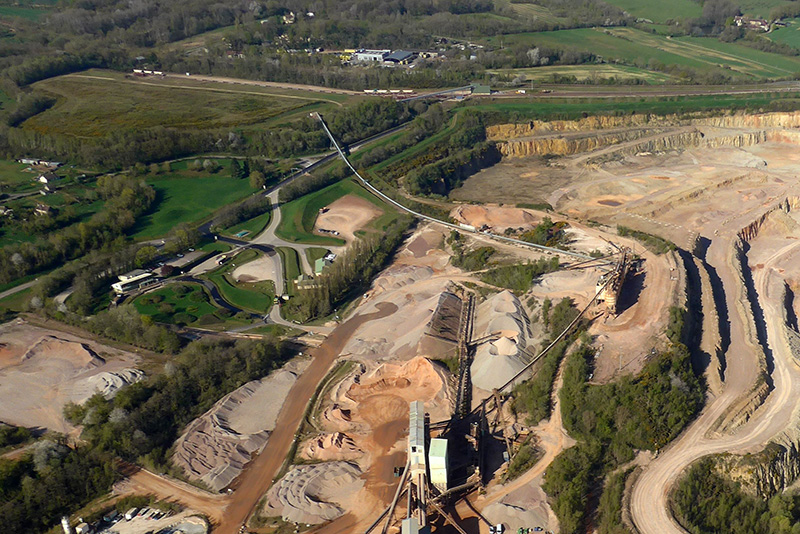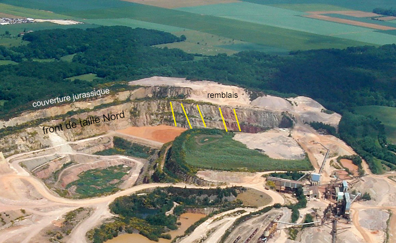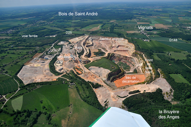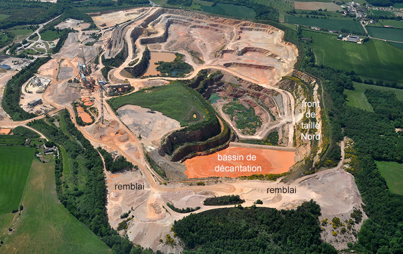 La partie nord-est de la carrière (au premier plan) est en fin d’exploitation et en voie de comblement. Les anciens fronts de taille encadrent un bassin de décantation.