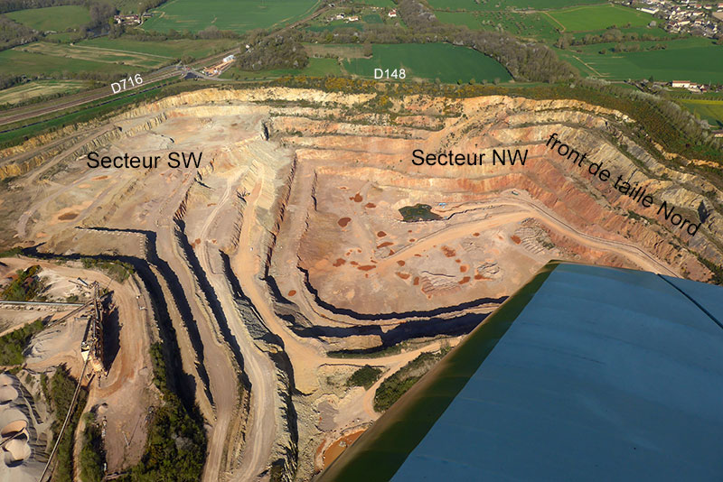Le secteur nord-ouest est exploité sur 4 niveaux, avec une excavation atteignant 100 m de profondeur. L’exploitation est limitée à l’Ouest par la route D148, qui longe le front de taille. Une extension d’exploitation est ouverte dans le secteur sud-ouest, sur un niveau.