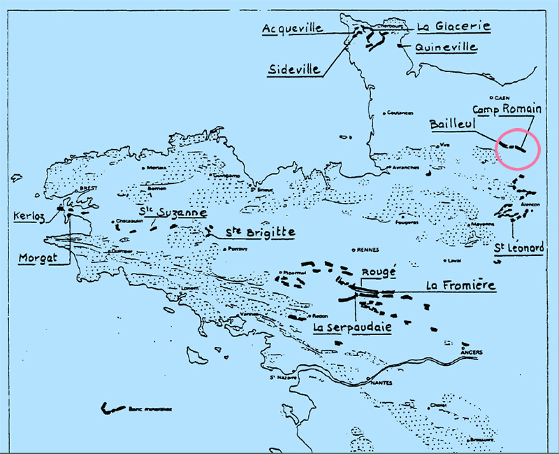 Cette carte du Massif armoricain localise les niveaux de Grès armoricain minéralisés (grès à zircon et rutile). Le site du Vaudobin est situé près de Bailleul et du Camp romain (Camp de Bierre).