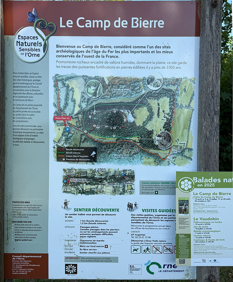Considéré comme l’un des sites archéologiques de l’âge du Fer les plus importants de l’Ouest de la France, le Camp celtique de Bierre est installé sur un site naturel façonné par la géologie ; les deux cluses qui traversent la barre de Grès armoricain ont isolé un éperon rocheux sur lequel des fortifications ont été construites il y a près de 3000 ans. Cet éperon domine une plaine fertile jusqu'à la vallée de la Dives. |