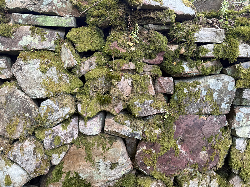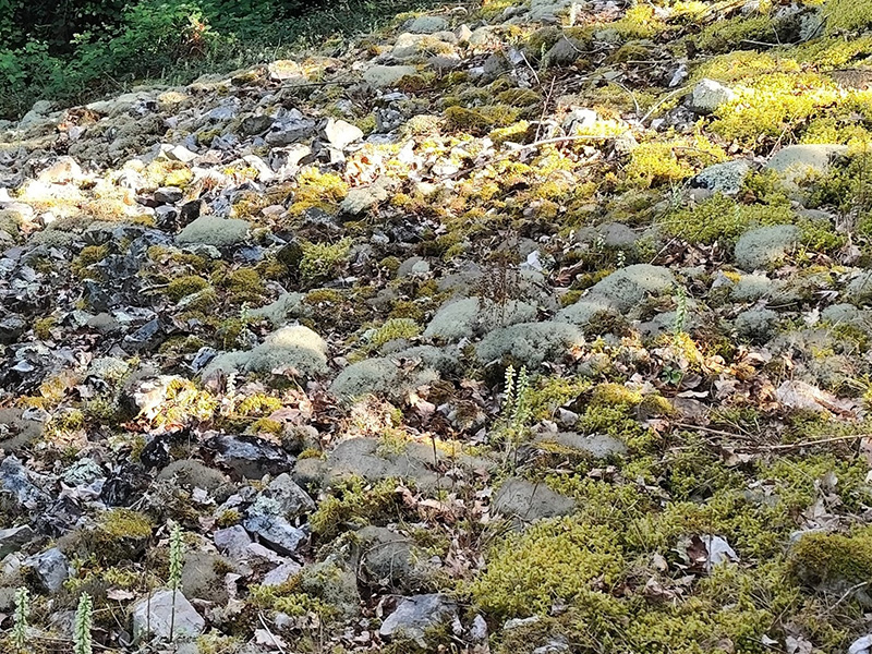 Le pierrier est colonisé par des lichens et des mousses, capables de se développer sur la roche nue. Des lichens ramifiés du type cladonie (Cladonia portentosa) recouvrent des blocs de grès en formant des coussins gris vert clair. Entre les blocs, se développent les « nombrils de Vénus », acidophiles et silicicoles. |
