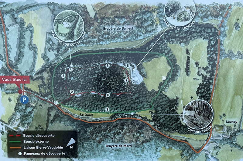Un autre circuit (panneaux 1, 9 et 10), plus externe, permet de faire le tour de l’éperon en suivant les deux vallons qui traversent la barre de Grès armoricain. |