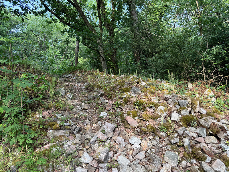 Au sommet de l’éperon rocheux, le chemin d’accès franchit un talus de pierres. Cet amoncellement de blocs de Grès armoricain correspond à la muraille effondrée de l’enceinte fortifiée construite à l’âge du Fer.