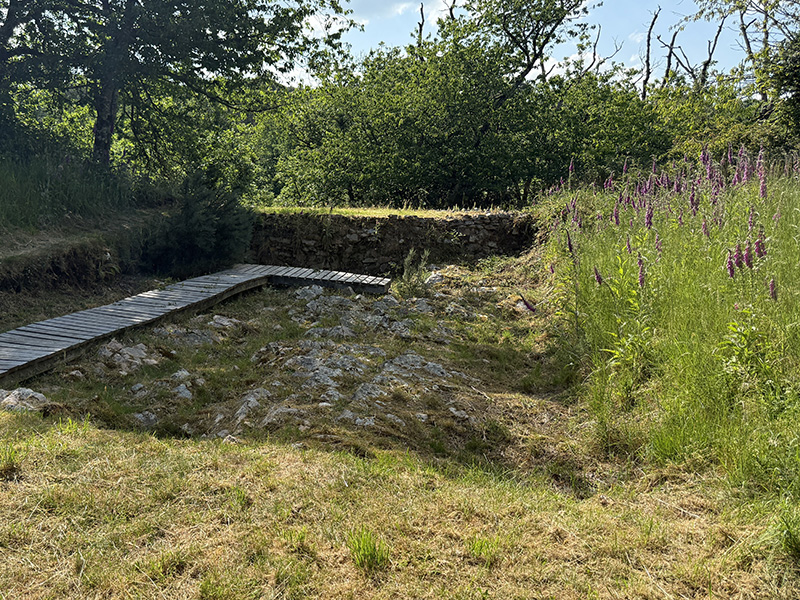 Des bancs de Grès armoricain affleurent dans une excavation aménagée au pied de la muraille lors des fouilles archéologiques. Dans la partie herbue (à droite sur la photo), on peut noter la présence de digitales pourpres, qui sont des plantes silicicoles.