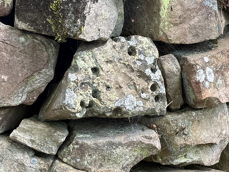 Des blocs de Grès armoricain de toutes tailles ont été assemblés en un mur de pierres sèches, sans liant. Ces blocs exposent les caractéristiques lithologiques du Grès armoricain. Certains blocs peuvent présenter des traces fossiles. |