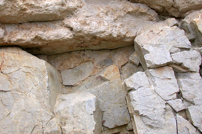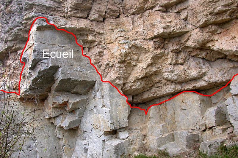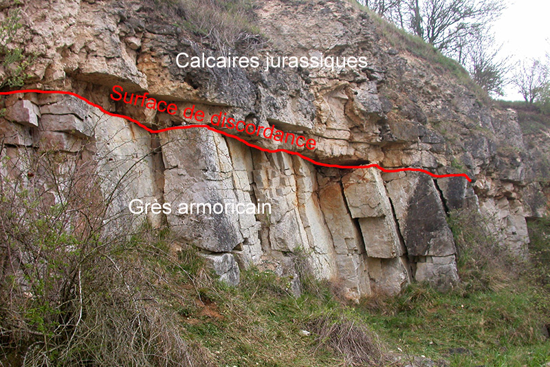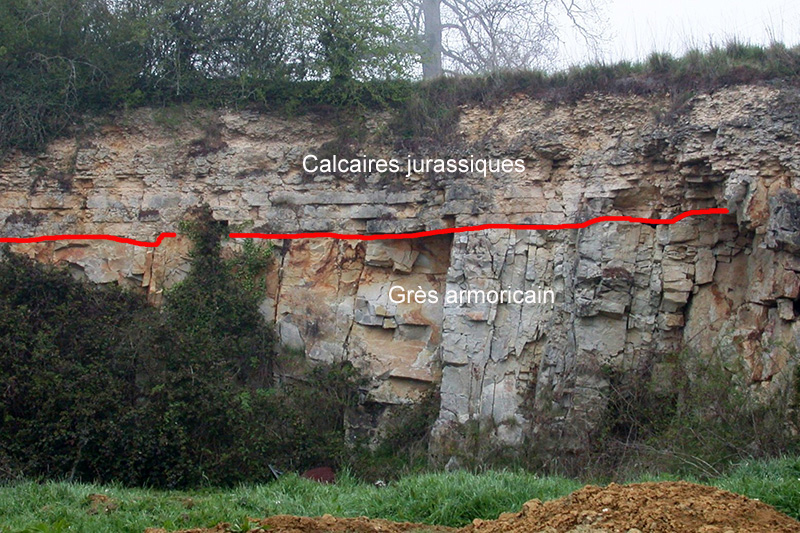 Les calcaires du Faciès de bordure des écueils (Jurassique – Bathonien), subhorizontaux, reposent sur le Grès armoricain (Ordovicien) redressé à la verticale. La surface de discordance correspond à la surface d’érosion post-varisque qui résulte de l’aplanissement de la chaîne varisque.