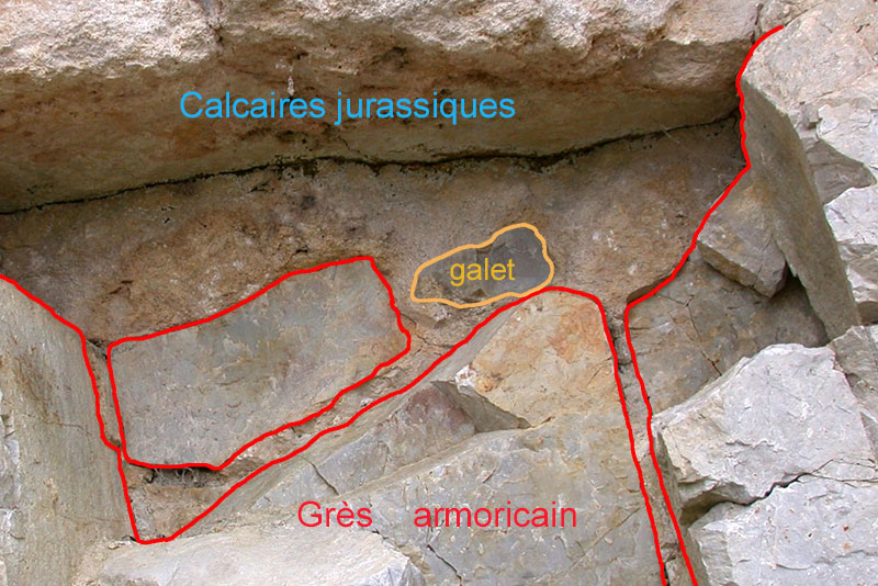 Les calcaires jurassiques comblent les anfractuosités crées par l’érosion des bancs de Grès armoricain subverticaux. La surface post-varisque présente des courbes adoucies qui témoignent d’une érosion chimique, par dissolution.