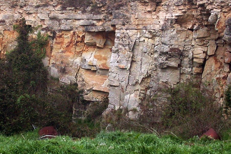Dans le secteur NE de l’ancienne carrière, le front de taille expose les coupes transversales et les surfaces des bancs du grès armoricain. |