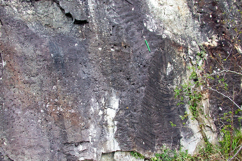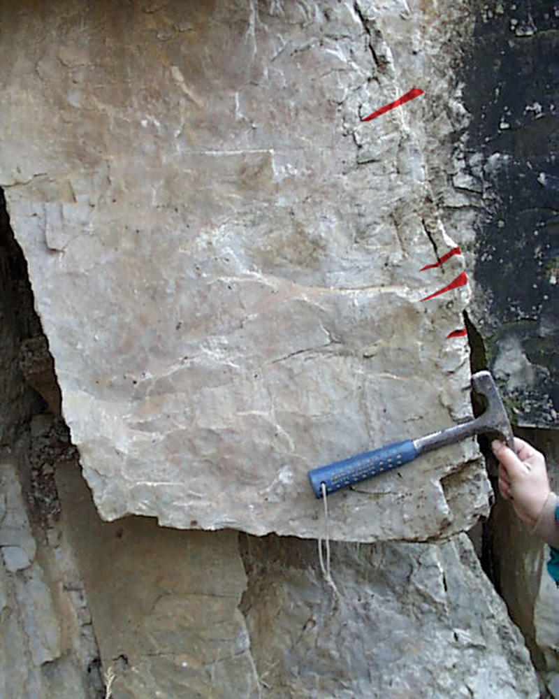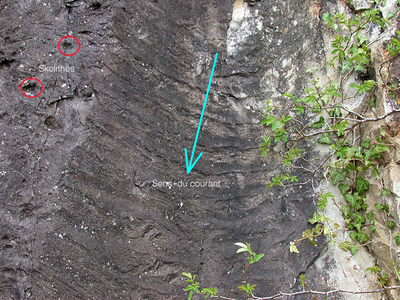 Des terriers (Skolithos) marquent la partie supérieure de ce banc vu de profil. La présence de terriers constitue un bon critère de polarité en indiquant la partie supérieure des bancs.