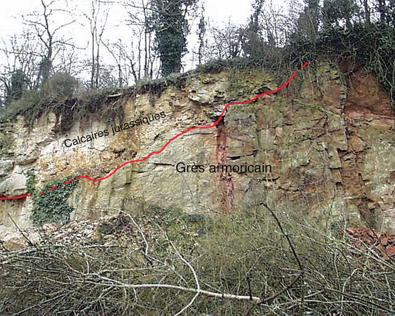 Les quartzites du Grès armoricain sont des roches très dures et résistantes à l’érosion. Ils n’ont pas été complètement aplanis par l’érosion post-varisque Les bancs plus résistants constituent des reliefs résiduels qui ont été progressivement recouverts par les calcaires du Faciès de bordure des écueils, au Bathonien (Jurassique). Après érosion de la couverture calcaire, le Grès armoricain affleure à la surface au niveau de ce paléorelief.