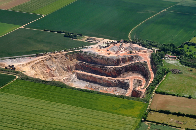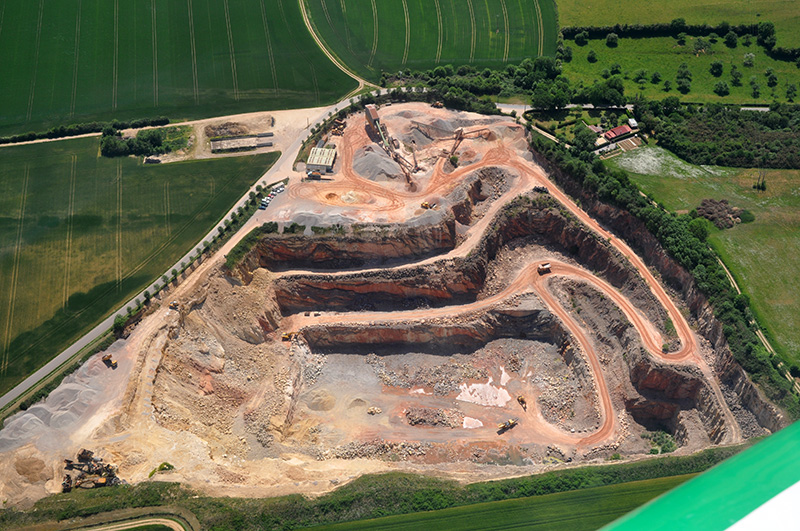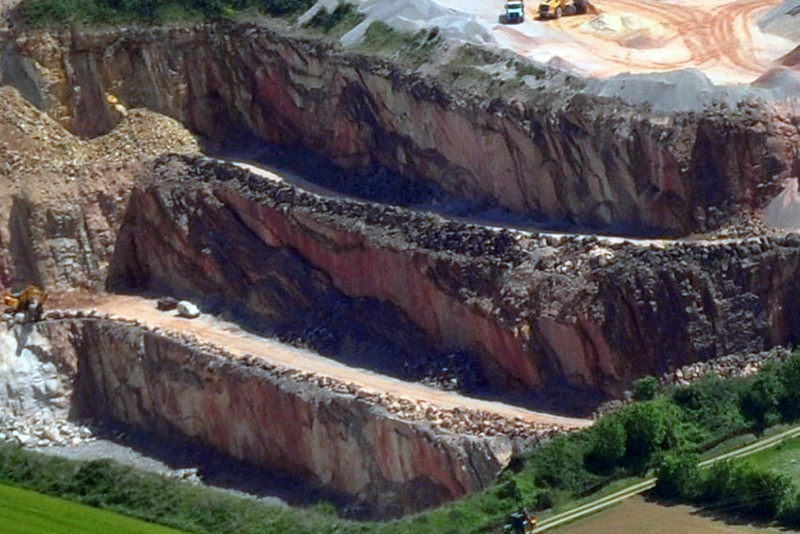 La carrière en activité présente un front de taille en trois paliers sur une hauteur totale d'environ 40 mètres. Le secteur Est (à gauche sur la photo) est en cours de remblaiement. |