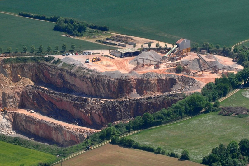 Parmi les installations, on distingue un concasseur (bâtiment central surélevé) et des convoyeurs. Le Grès armoricain est exploité pour la production de granulats ; une autorisation préfectorale du 28/07/2003 permet une extraction maximale de 250 000 t/an jusqu'au 28/07/2033. |